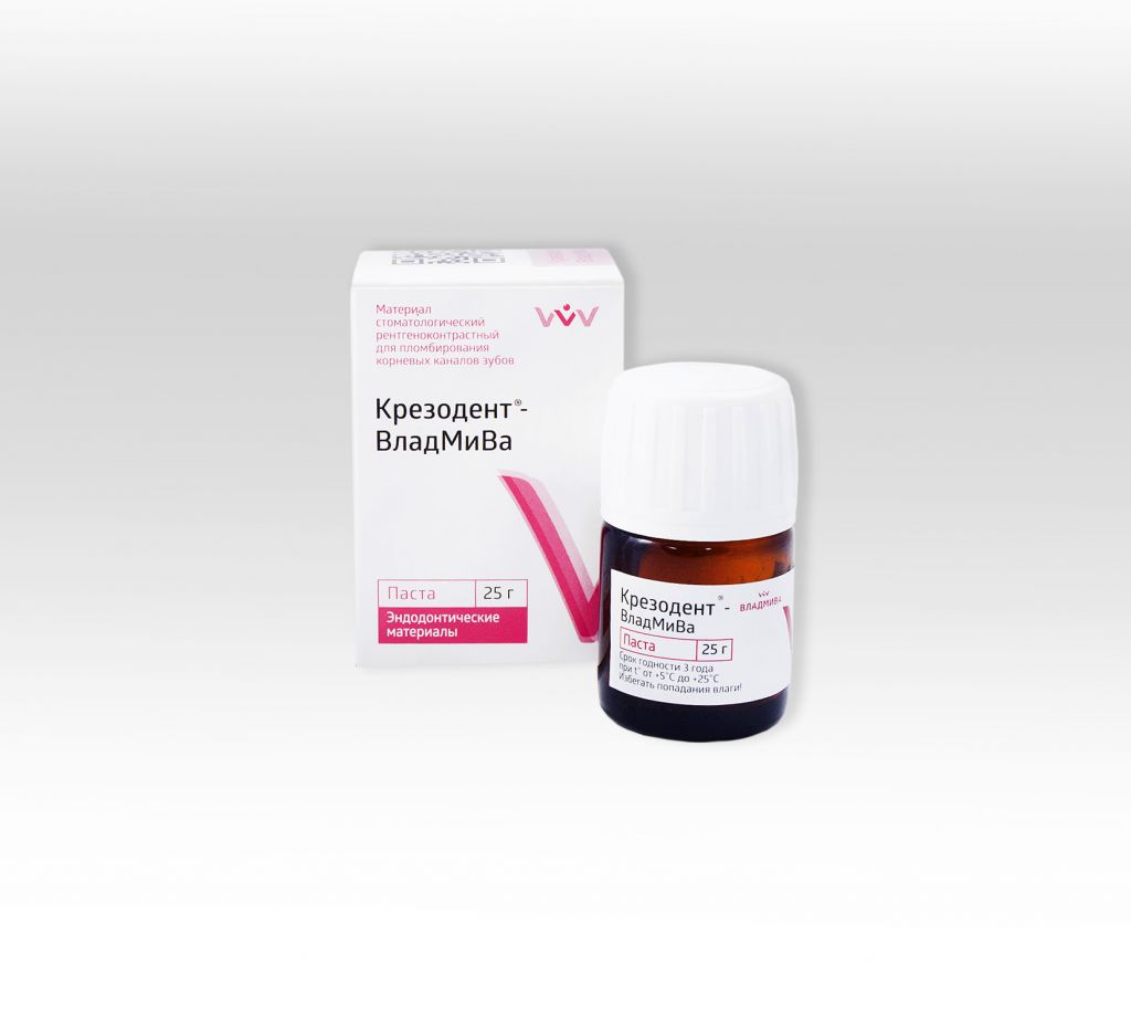 Паста «Крезодент-ВладМиВа» рентгеноконтрастна, легко вводится и полностью заполняет корневой канал. Материал отверждается в течение 24-78 часов, связывая внутриканальную влагу.