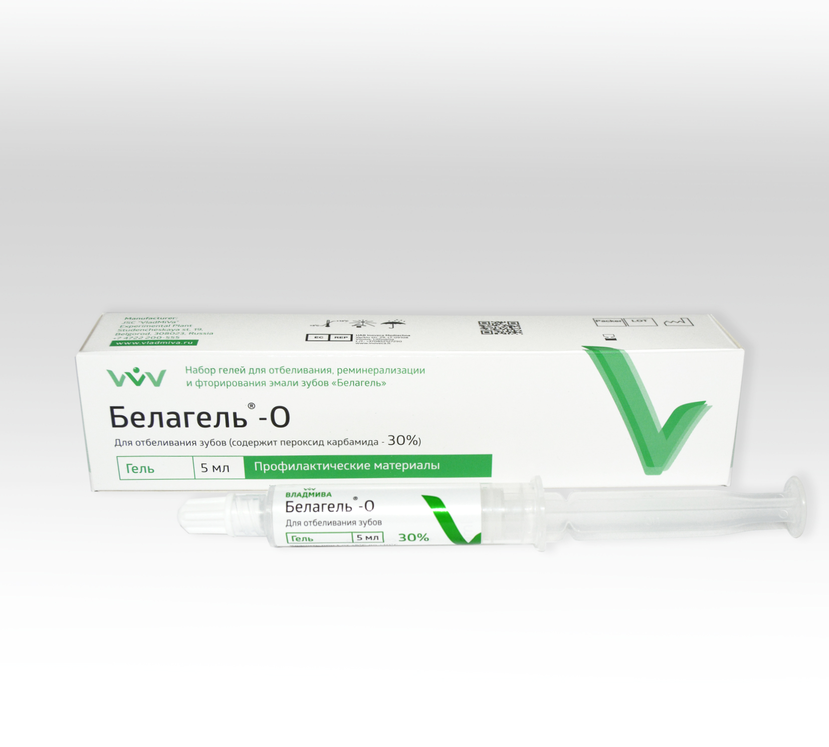 «Белагель О» - универсальная отбеливающая гелевая система с пероксидом карбамида в качестве наиболее современного и щадящего отбеливающего агента. Пероксид — источник атомарного кислорода, под действием которого происходит расщепление органических веществ, окрашивающих ткани зуба. Активный кислород устраняет бактерии, способствующие формированию неприятного запаха. Отбеливающий гель содержит 30% воды, следовательно, не происходит высушивание и обезвоживание твердых тканей. Зубы не теряют блеск. Входящие в состав «Белагель О» ионы калия предотвращают появление чувствительности зубов.