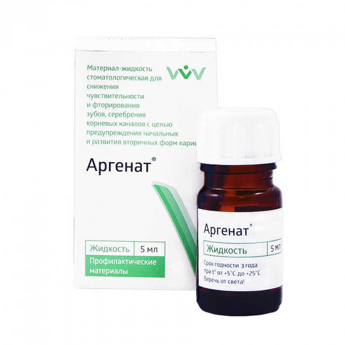«Аргенат» однокомпонентный - предназначен для фторирования и снижения чувствительности зубов (кроме фронтальных), предотвращения развития вторичного кариеса, а также для серебрения корневых каналов зубов при начальных формах развития кариозных процессов (особенно кариеса молочных зубов).
