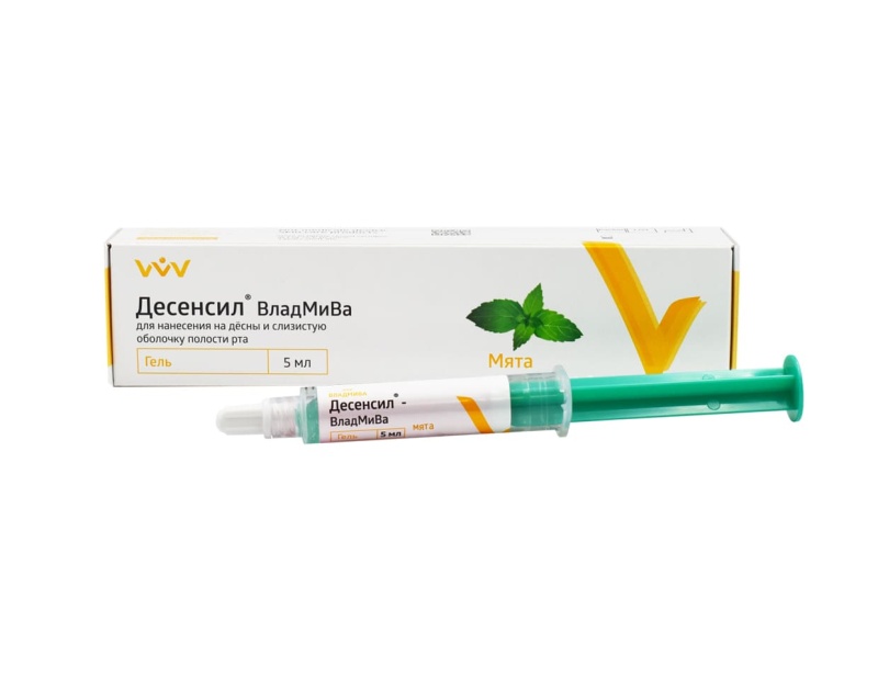 Гель «Десенсил ВладМиВа» выпускается с различными вкусовыми добавками; имеет удобную консистенцию для точечного нанесения; эффективно воздействует на рецепторы участка аппликации, ингибируя проникновение ионов натрия в нервные волокна.