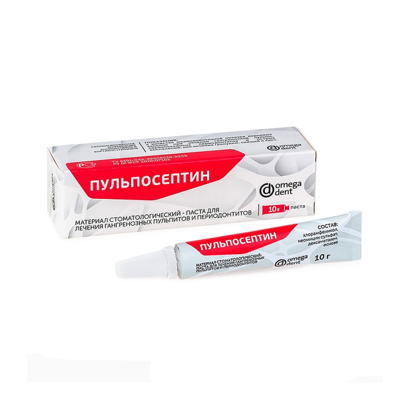 Все описание Пульпосептин - паста для лечения гангренозных пульпитов и периодонтитов.