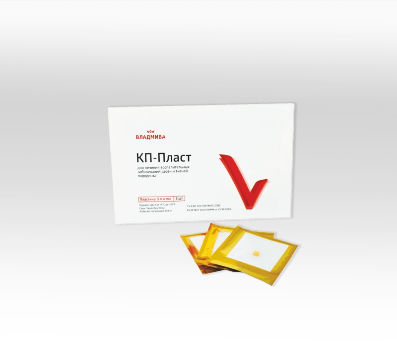 Применение пластин «КП-пласт» позволяет пропонгирован- но поддерживать необходимую терапевтическую концентрацию антимикробного вещества в поражённых тканях пародонта.