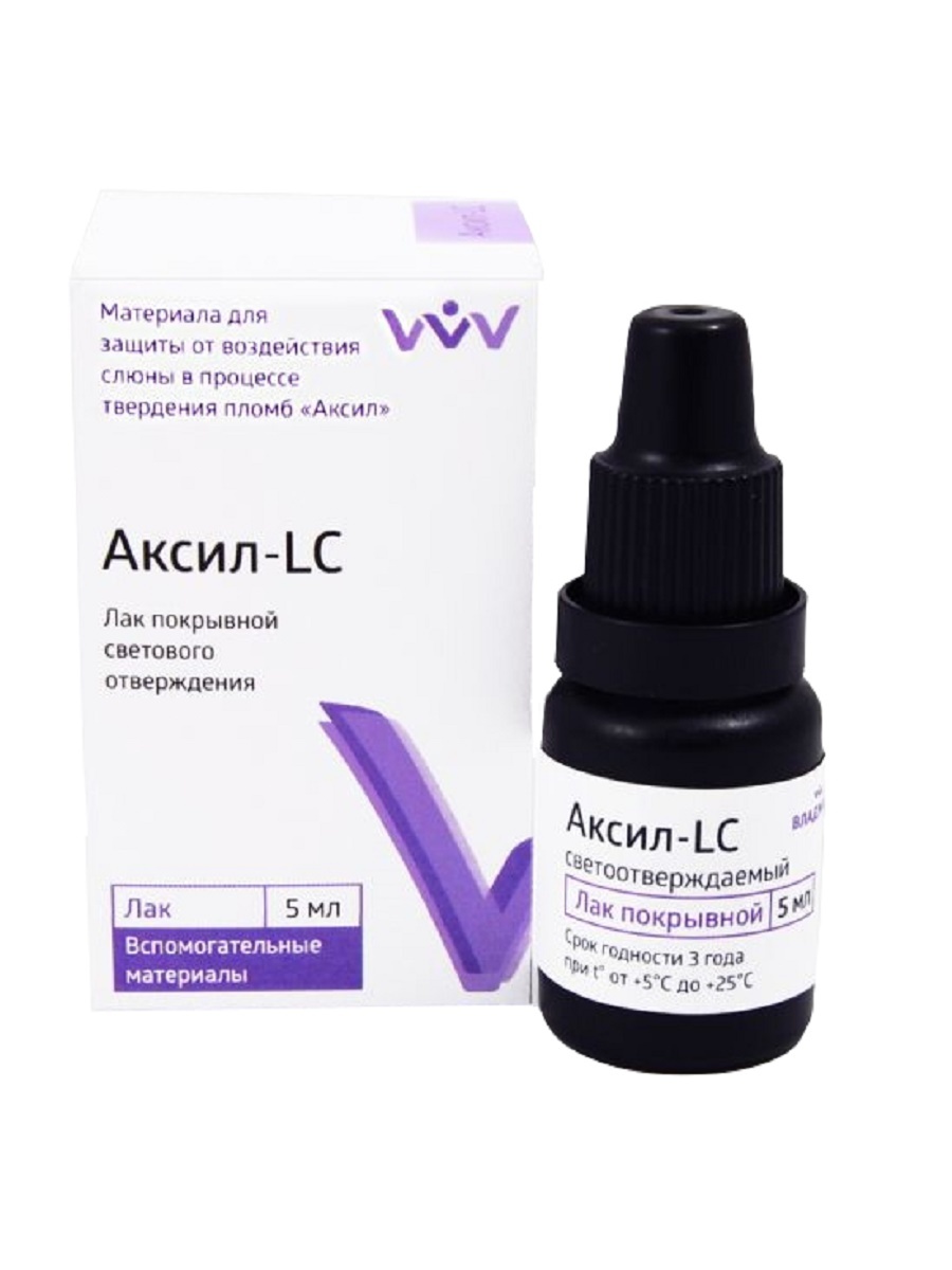 «Аксил»-LC обладает хорошей адгезией к пломбировочным материалам, быстро отверждается под действием света фотополимеризатора и образует тонкую пленку, которая надежно защищает стеклоиономер или композит от воздействия влаги в процессе отверждения (не менее 24 часов).