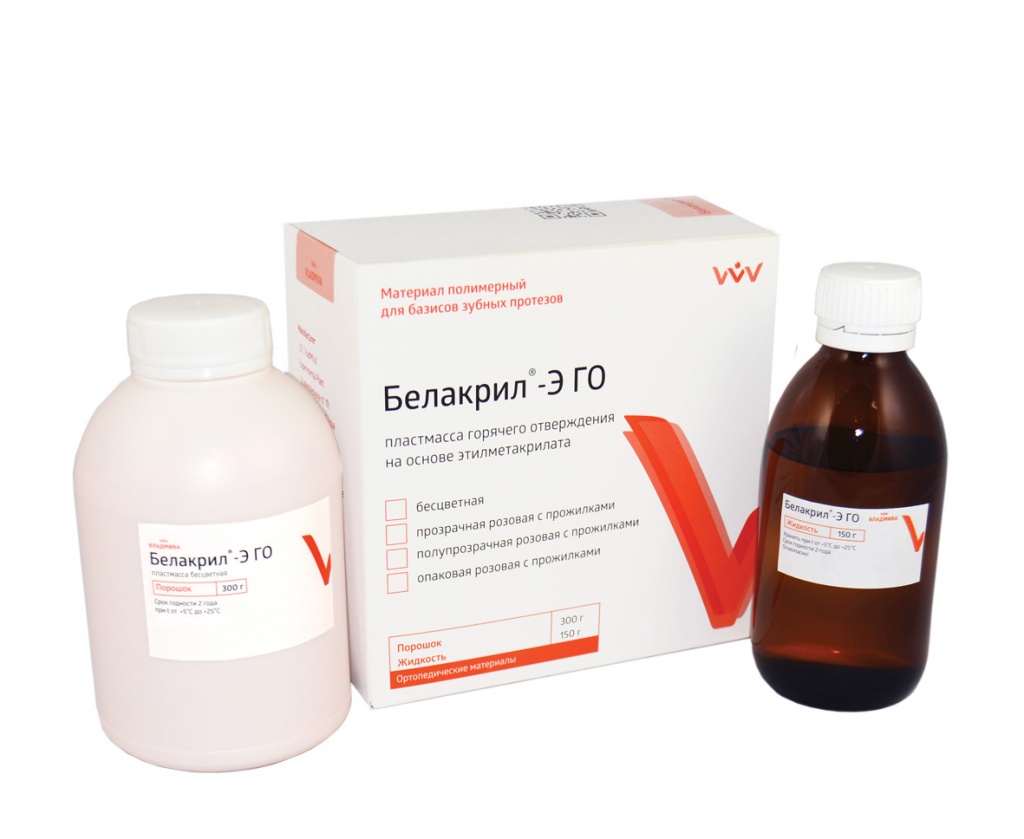 Базисные материалы «Белакрил» выпускаются в виде двух компонентов - порошка, содержащего полиэфиры метакриловой кислоты, катализатор реакции полимеризации перекись бензоила, и жидкости, содержащей мономер метилметакрилат (М) и/или мономер этилметакрилат (Э), после смешивания порошка с жидкостью образуется полимер, твердеющий при нагревании (горячего отверждения) - ГО или без нагревания (самотвердеющий) - ХО. Базисные материалы «Белакрил» отличает высокая технологичность, простота и быстрота изготовления изделий, имеющих высокое качество, функциональную долговечность, натуральный внешний вид и биосовместимость.