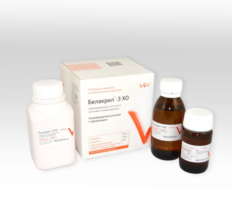 Базисные материалы «Белакрил» выпускаются в виде двух компонентов - порошка, содержащего полиэфиры метакриловой кислоты, катализатор реакции полимеризации перекись бензоила, и жидкости, содержащей мономер метилметакрилат (М) и/или мономер этилметакрилат (Э), после смешивания порошка с жидкостью образуется полимер, твердеющий при нагревании (горячего отверждения) - ГО или без нагревания (самотвердеющий) - ХО. Базисные материалы «Белакрил» отличает высокая технологичность, простота и быстрота изготовления изделий, имеющих высокое качество, функциональную долговечность, натуральный внешний вид и биосовместимость.